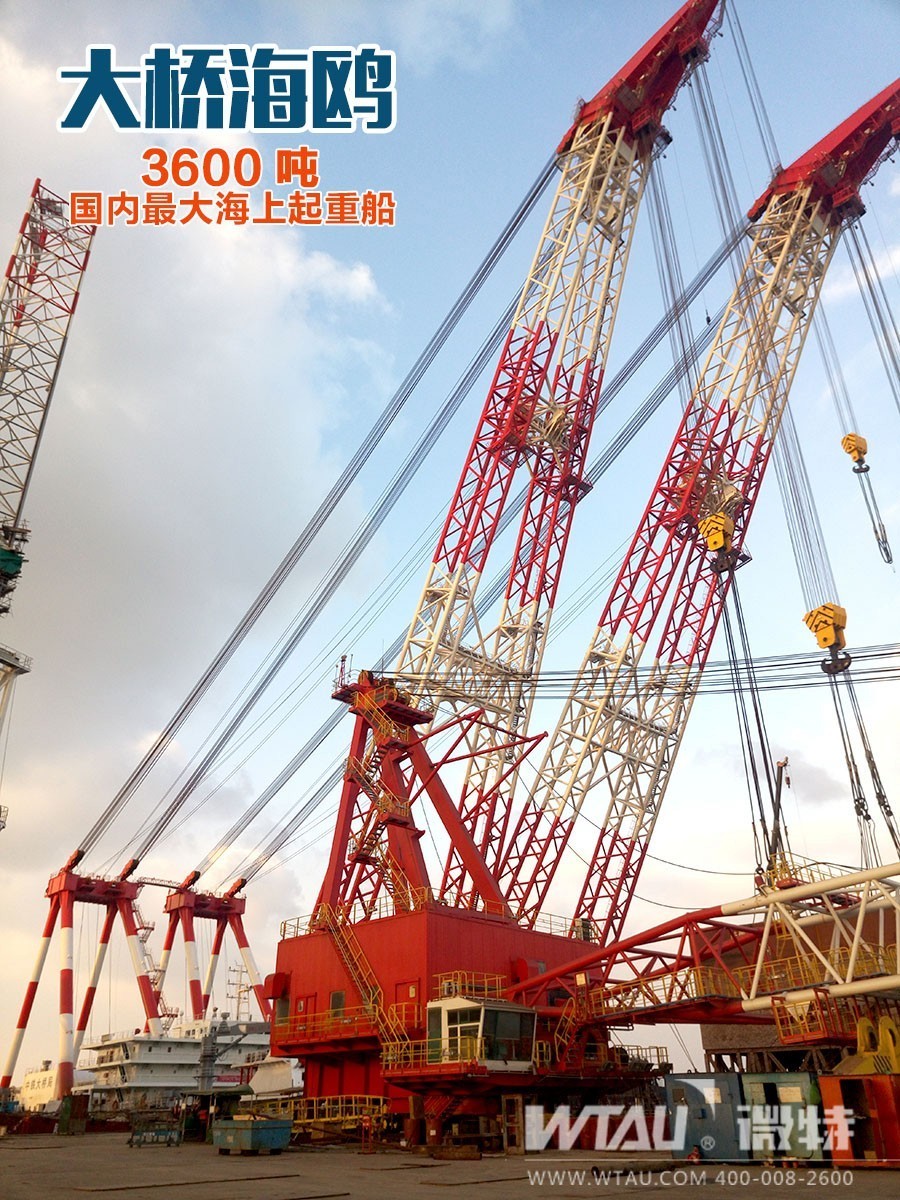 “大橋海鷗”3600T起重船為中國自主研發(fā)設計制造,平潭海峽大橋80米和88米鋼桁梁的整孔吊裝架設,需要起重量3200噸以上、吊高110米的起重船。為滿足平潭海峽公鐵兩用大橋整孔鋼梁架設及大型構(gòu)件的海上吊裝需要,2015年初,中鐵大橋局投資3.4億元設計建造了這艘3600噸起重船。它是中鐵大橋局“走向海洋”戰(zhàn)略實施的重要裝備支撐。