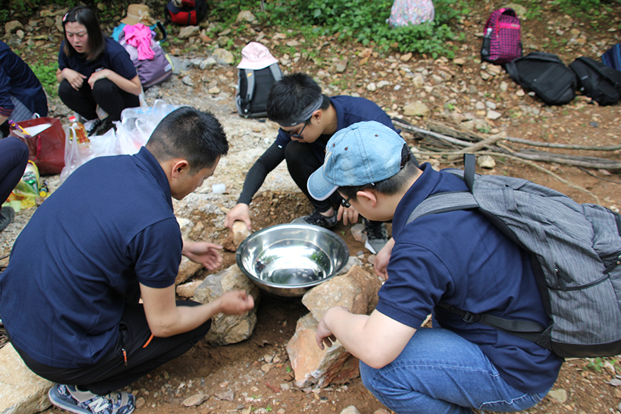 經(jīng)過半天的登山式行軍,中午,我們來到山谷中一處較平坦地地方,各隊(duì)開始分工埋鍋造飯,相互配合做中餐。