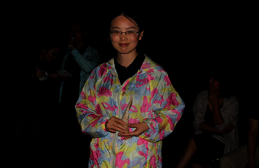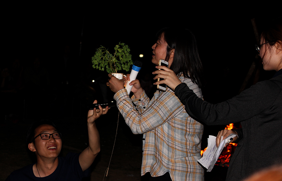 晚會(huì)最后,各隊(duì)拿出各自行軍過程中尋得的寶物,在這里微特公司首次愛心拍賣會(huì)溫情上演。(上圖為Supreme隊(duì)持寶人正在講解她所持的盆栽寶貝,左右兩邊的隊(duì)員正在為寶貝打燈光)