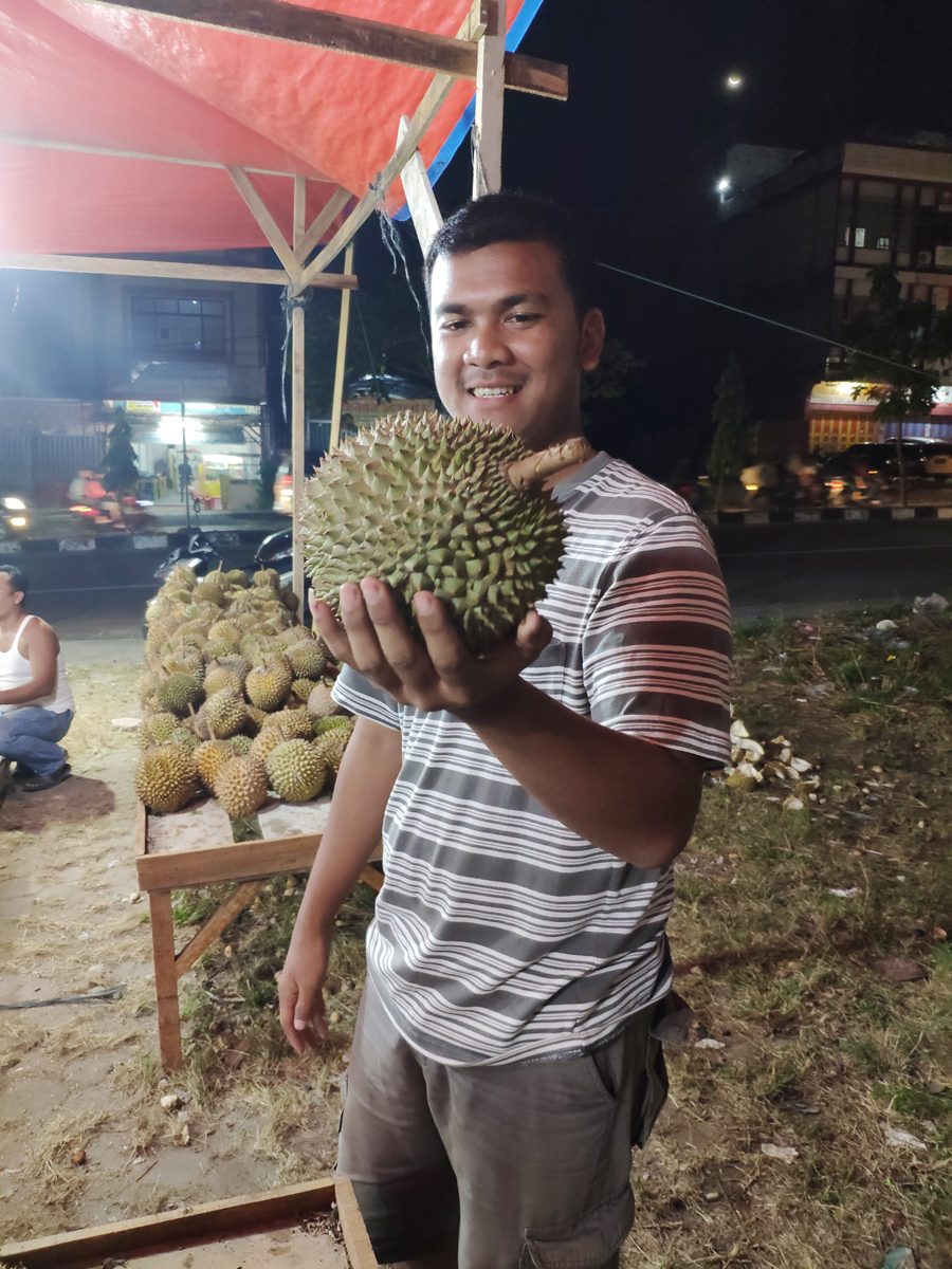 因為棉蘭與北干巴魯同在蘇門答臘島,棉蘭的小榴蓮在北干特別便宜,只需15000(約7.5人民幣)印尼盧比,就能飽飽吃上一整個榴蓮,是不是很劃算呢?吃完了榴蓮,味道太大怎么辦?往榴蓮殼里倒上水,等上三五分鐘,喝下去,消火去味兒,這可是當?shù)厝瞬惠p易告知的絕技呢。