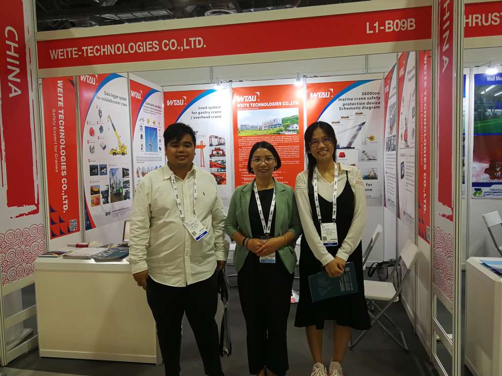 ▲微特事業(yè)部總經(jīng)理與新加坡達(dá)豐公司在會(huì)場(chǎng)外的工地現(xiàn)場(chǎng)合影,背后正在施工的吊車(chē)上安裝的正是微特的力矩限制器產(chǎn)品