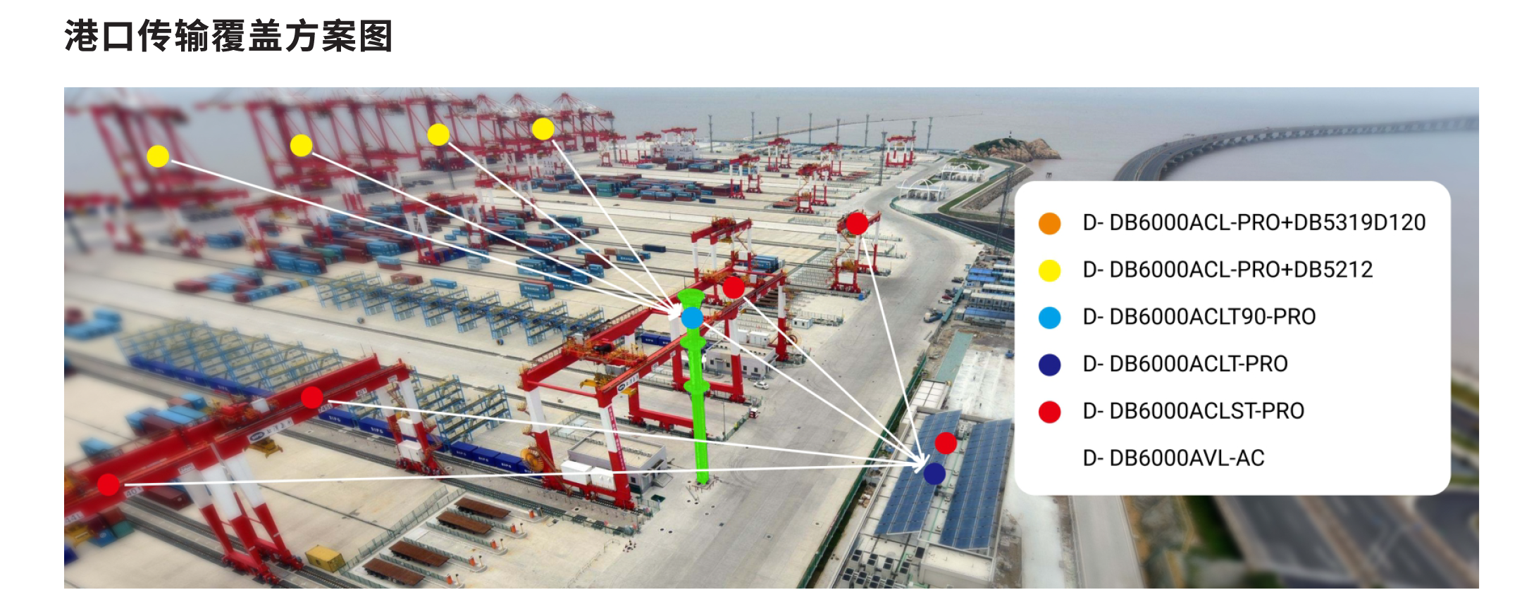 港口無線覆蓋方案:對于固定位置吊機可以采用點對點或多點的定向傳輸布局方式覆蓋,對于車載移動的設(shè)備可 以在吊車移動區(qū)域全向覆蓋在橋接定向傳輸?shù)牟季址绞健?br />