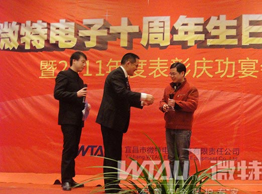 2011年度先進(jìn)表彰,明星閃耀?,F(xiàn)生產(chǎn)部主管:羅毅,榮獲年度最燦爛的大獎(jiǎng)“微特之星”稱號(hào)?。▓D為頒獎(jiǎng)現(xiàn)場(chǎng))